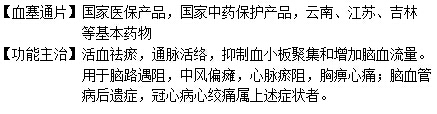 【功能主治】活血祛瘀,通脈活絡(luò),抑制血小板聚集和增加腦血流量。用于腦路遇阻,中風(fēng)偏癱,心脈瘀阻,胸痹心痛;腦血管病后遺癥,冠心病心絞痛屬上述癥狀者。