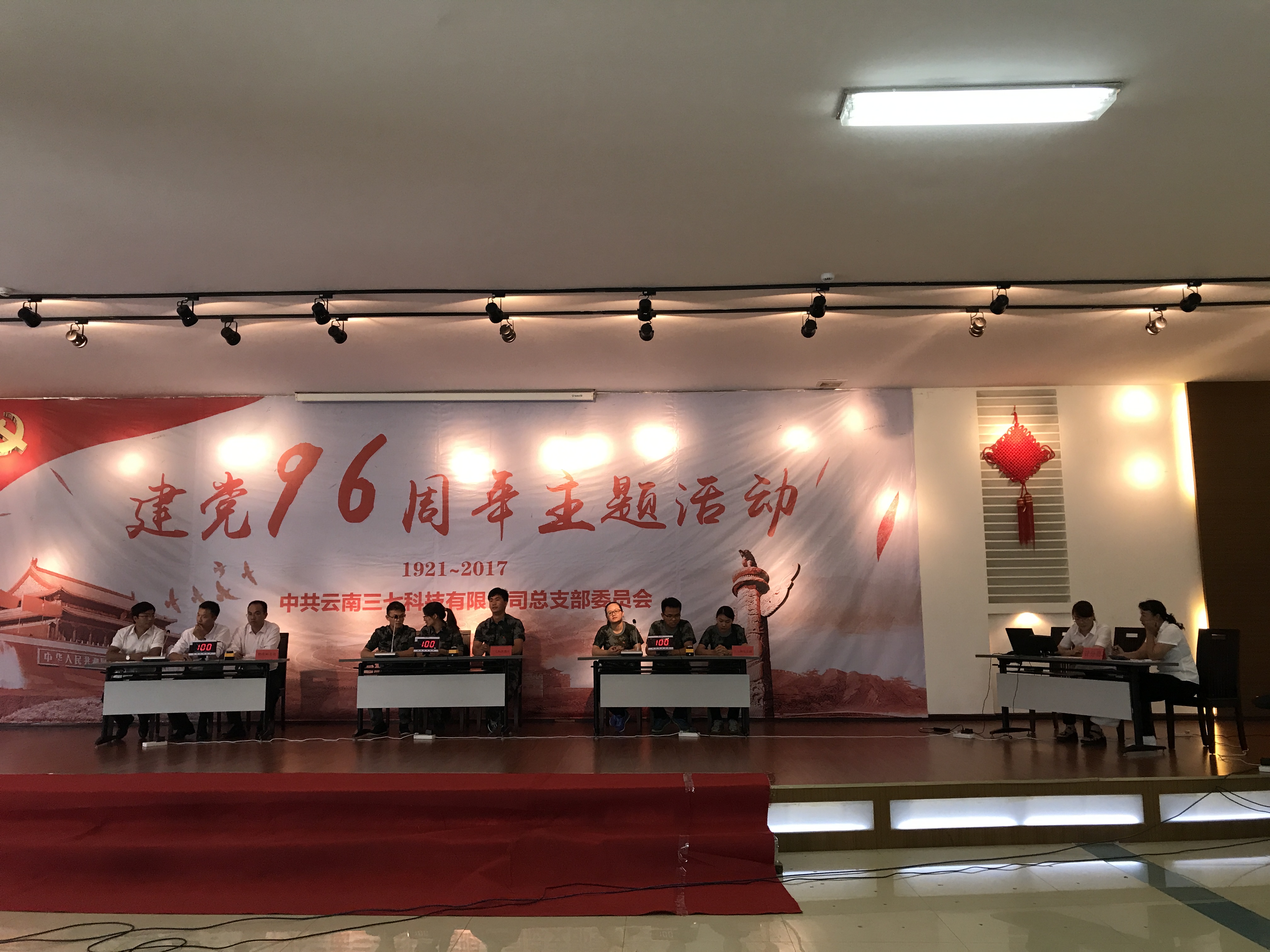 2017年7月7日至8日,云南三七科技有限公司黨總支在文山舉行慶祝建黨96周年系列活動(dòng)。7日上午,在特安吶公司一會(huì)議室,舉行了書記講黨課活動(dòng),三七科技公司黨總支書記王霞同志為全體黨員講授了一堂別開生面的黨課。隨后舉行歌詠比賽和黨建知識(shí)競賽。參加歌詠比賽的有三七科技公司總部代表隊(duì)、三七科技藥業(yè)公司代表隊(duì)、特安吶公司代表隊(duì),各參賽代表隊(duì)合唱了必唱歌曲《紅土好兒郎》,又分別演唱了《走進(jìn)新時(shí)代》、《打靶歸來》、《沒有共產(chǎn)黨就沒有新中國》等歌曲,他們精彩的表演獲得陣陣掌聲,特別是特安吶公司代表隊(duì)一出場,就吸引了全場的關(guān)注,參賽隊(duì)員穿著鮮艷的民族服裝,以飽滿的精神、嘹亮的歌聲征服了評(píng)委和觀眾,獲得了比賽第一名。黨建知識(shí)競賽分為必答題、選擇題、搶答題三個(gè)環(huán)節(jié),三支代表隊(duì)你來我往、互不相讓,狹路相逢勇者勝,比拼的是速度和智力,當(dāng)選手回答出一個(gè)個(gè)準(zhǔn)確答案時(shí),觀眾席爆發(fā)出熱烈的掌聲。最終,三七科技公司總部獲得第一名。