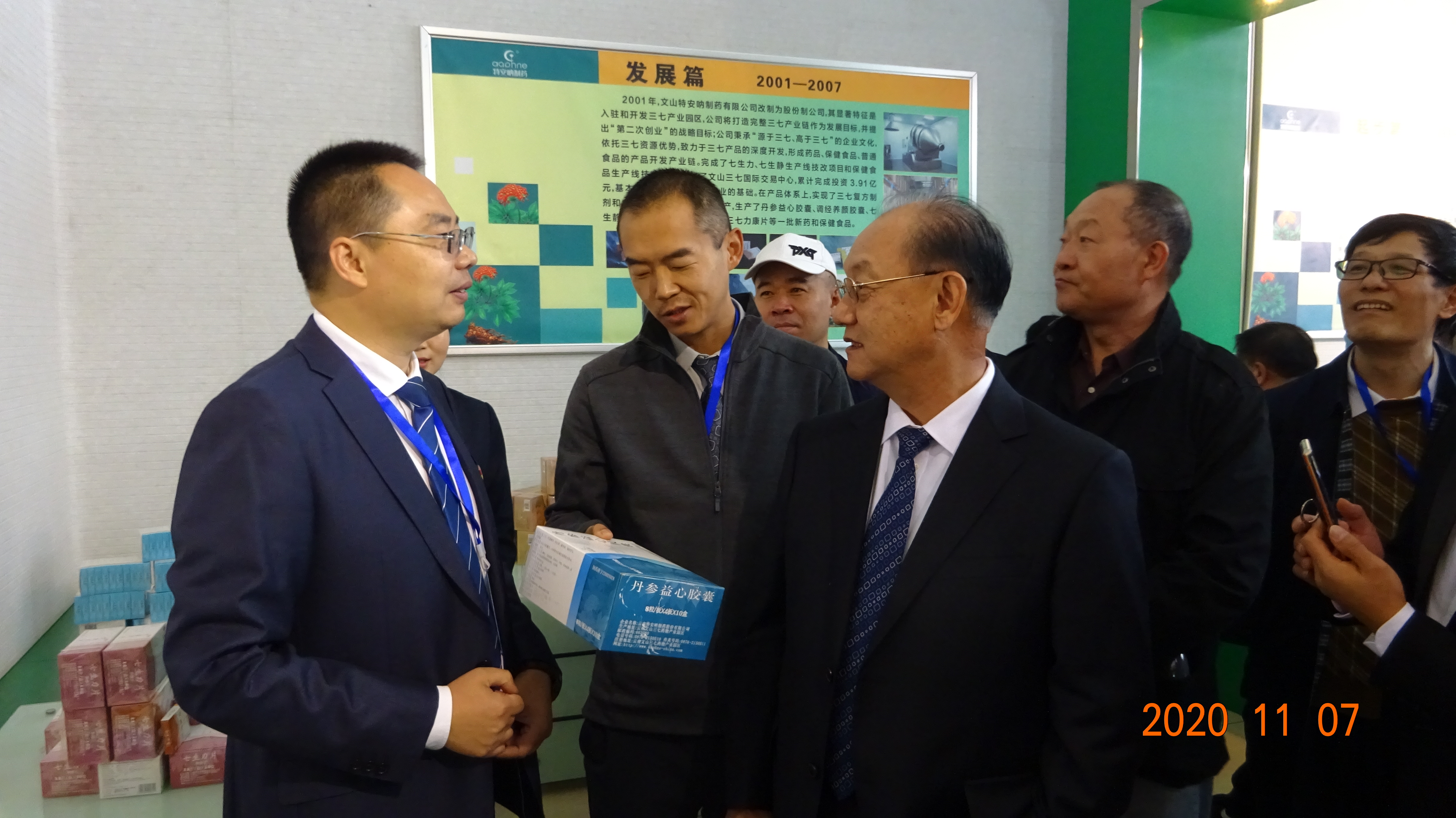 2020年11月7日,北京廣安門醫(yī)院原院長、國際歐亞科學院院士王階一行蒞臨特安吶公司參觀指導。云南康旅集團蔡嘉明副總裁、云南特安吶制藥股份有限公司副董事長兼總經理嚴野在展示廳迎接。嚴總向王階院士介紹了公司的創(chuàng)業(yè)歷程及產品情況,公司從租賃手工作坊生產到擁有占地200余畝、16條生產線的現(xiàn)代化生產基地,主打產品從頭痛粉、安乃近片到血塞通片、七生力片、七生靜片等三七系列精深加工產品的轉變,構建了“產品研發(fā)基地、三七GAP種植基地、中藥材加工基地、產品生產基地、物流倉儲基地”和“三七國際交易中心、商務服務中心、物資配套服務中心”為平臺的三七產業(yè)鏈。王階院士是云南文山人,這次是應文山州、市人民政府邀請,出席第六屆文山三七節(jié)。王階院士是主任醫(yī)師,博士研究生導師,中國中醫(yī)科學院首席研究員,從事中醫(yī)學臨床與研究二十余年,主持國家級科研課題10余項,主要研究方向為中醫(yī)藥防治心血管病、血瘀證與活血化瘀研究、中醫(yī)證候的規(guī)范化研究、中醫(yī)藥防治艾滋病等,發(fā)表核心期刊論文200余篇,SCI論文40余篇,總影響因子>100,所發(fā)文章被PlosOne、JEthnopharmacol等國內外著名期刊引用3000余次,主編著作10余部,榮獲國家科技進步一等獎1項,中華中醫(yī)藥學會科技進步一等獎2項,及其他省部級獎勵9項,國家發(fā)明專利3項。王院士可以說與特安吶公司頗有淵源,2001年公司在北京召開“特安吶產品研討會”時,王院士就出席了會議,為公司的產品研發(fā)提出了很好的意見。王院士拿起公司生產的產品“阿咖酚散”說,這個產品很好,見效快、價格低,治療頭痛發(fā)熱一包見效。王院士詳細詢問了公司主打產品“血塞通片”的生產及銷售情況,叮囑一定要把產品做實做優(yōu)做大。王院士指出公司的產品有較強的優(yōu)勢,如丹參益心膠囊,在治療冠心病、心絞痛等方面有確切療效,要好好進行產品二次開發(fā)。王院士與嚴野總經理就產品開發(fā)、臨床試驗、市場推廣等方面進行了交流,他希望公司立足于文山三七,加強與科研院校合作,引領三七產業(yè)發(fā)展,為中醫(yī)藥事業(yè)做出新的更大的貢獻。