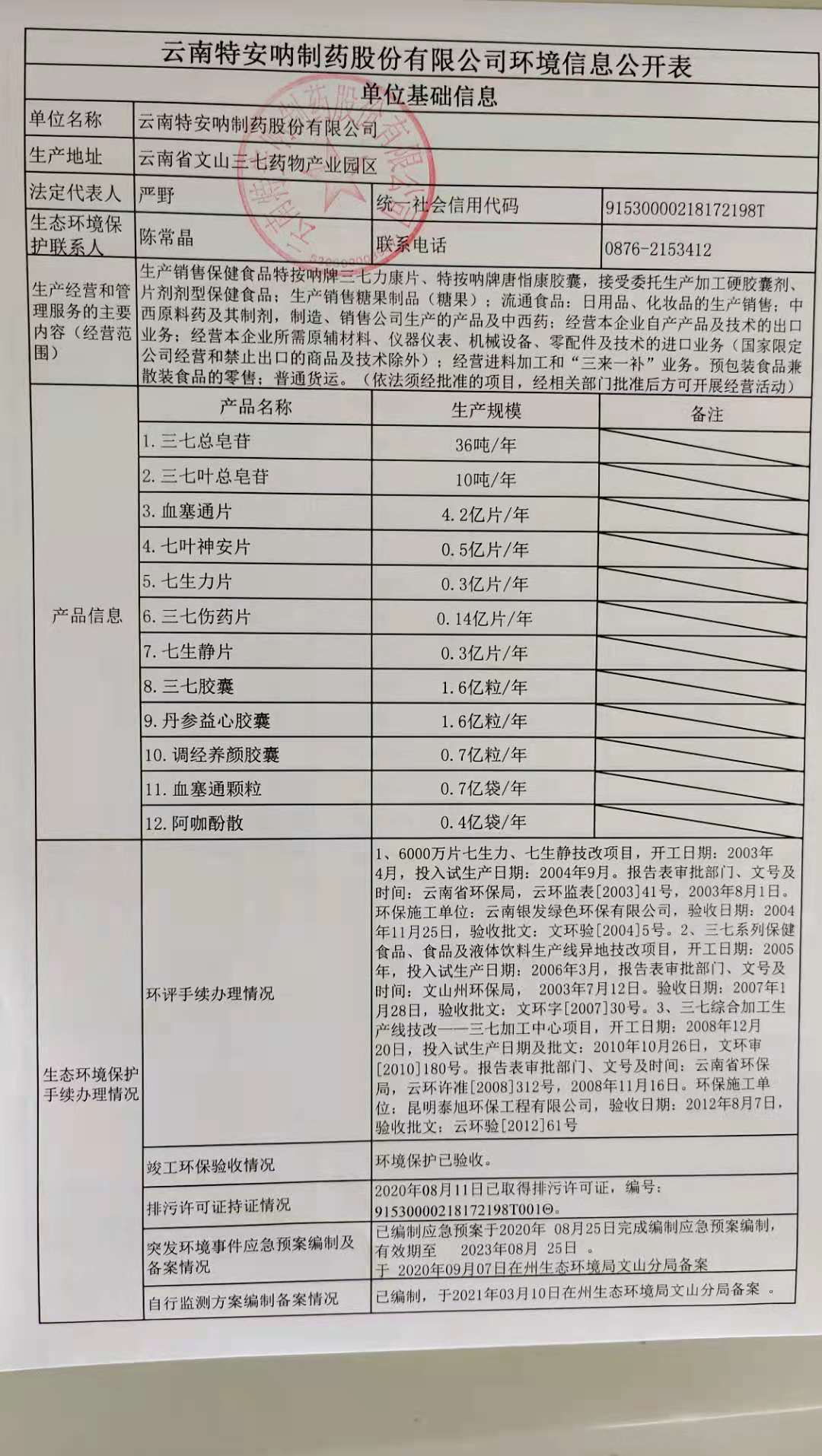 云南特安吶制藥股份有限公司2021年度環(huán)境信息公開。