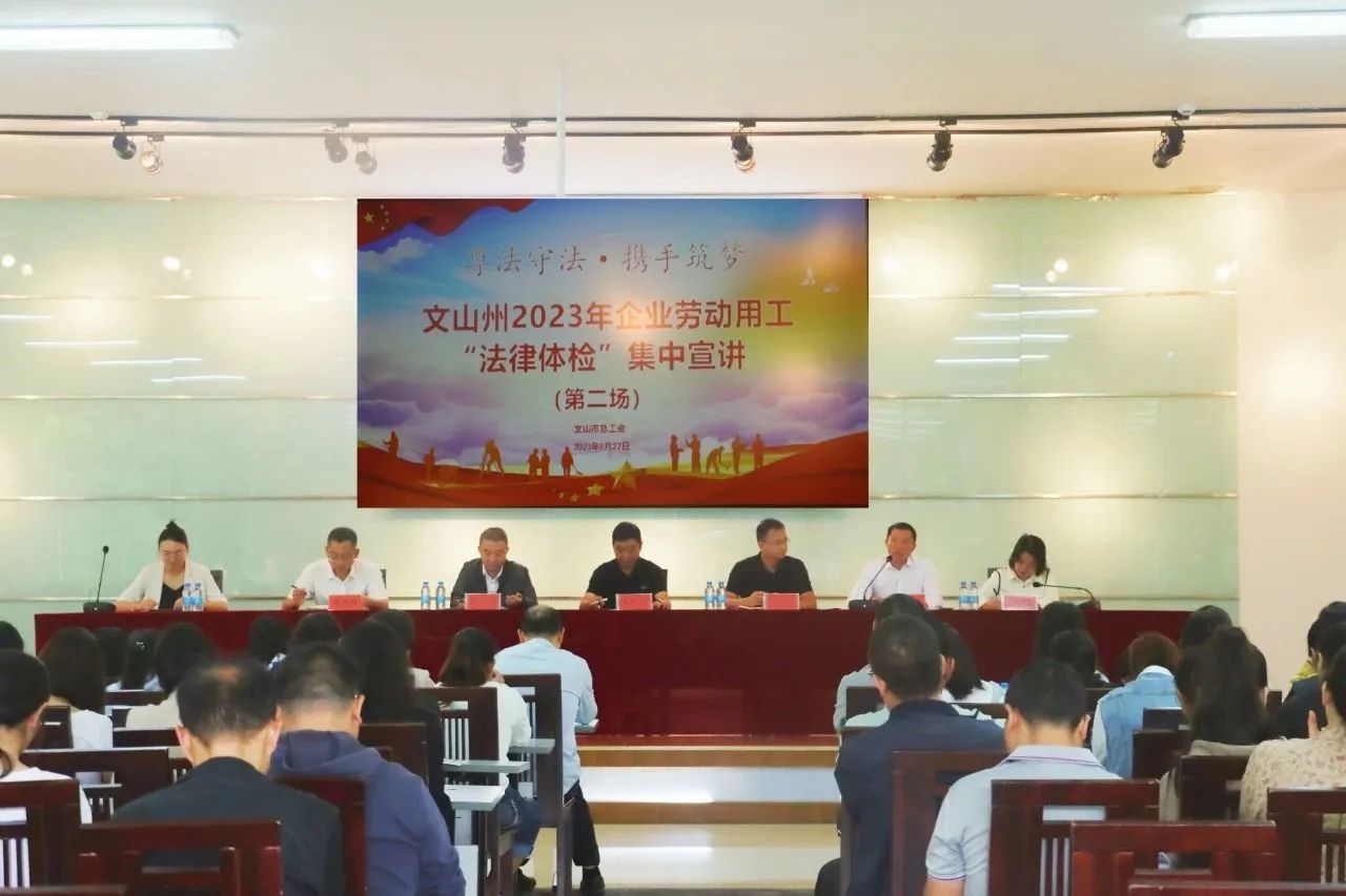 為落實好企業(yè)勞動用工合規(guī)合法要求,切實保障勞動者與用人單位(企業(yè))的合法權(quán)益,文山州、市總工會于9月27日在特安吶公司召開文山州2023年企業(yè)勞動用工“法律體檢”集中宣講。文山市轄區(qū)150家知名企業(yè)和新就業(yè)形態(tài)企業(yè)代表及公司工會和相關(guān)部門負責人參加宣講會。