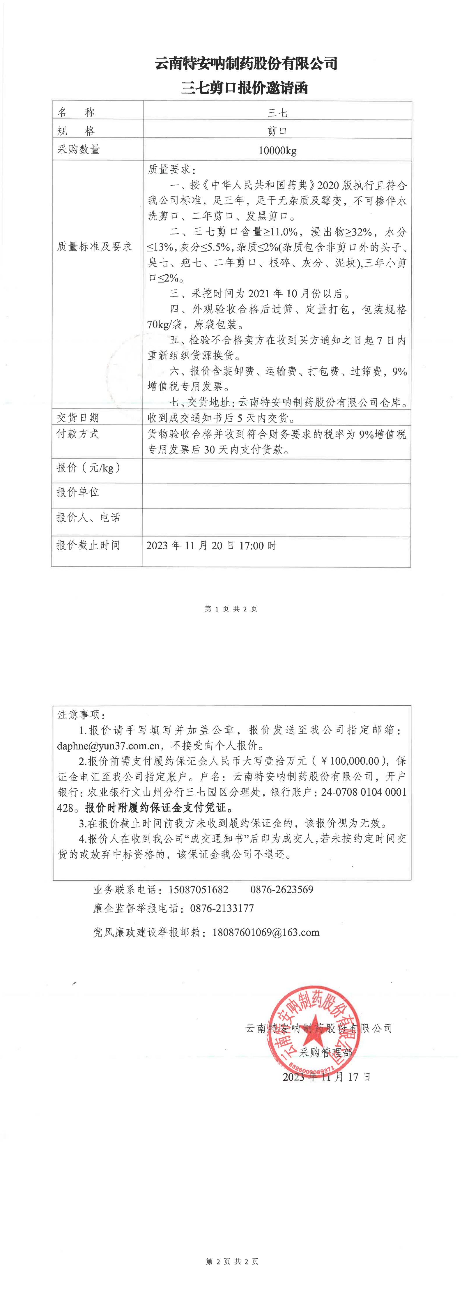 云南特安吶制藥股份有限公司 三七剪口報(bào)價(jià)邀請(qǐng)函