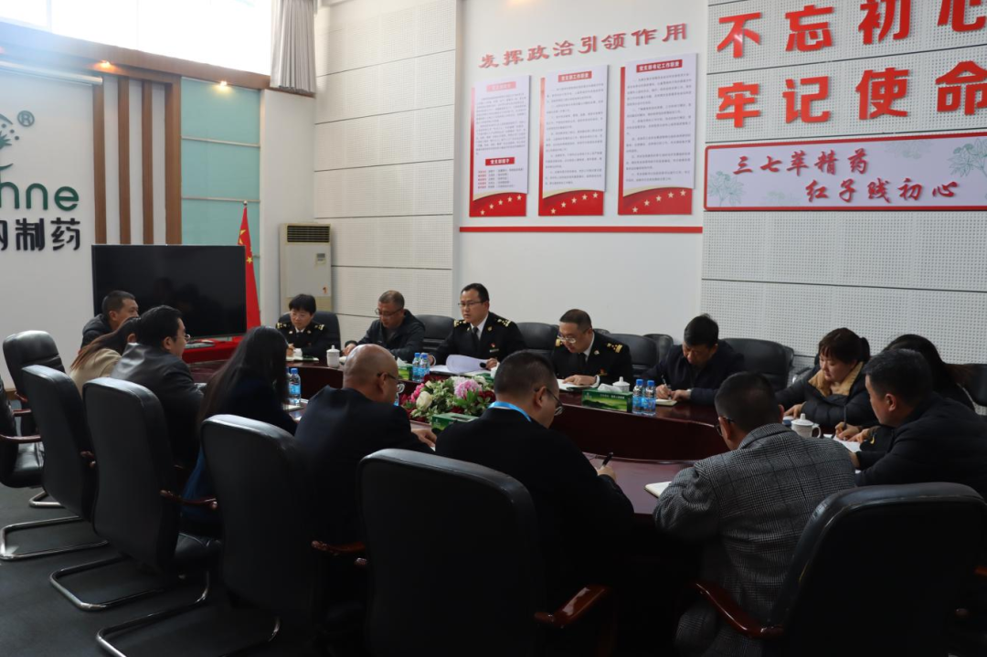 12月19日,天保海關(guān)副關(guān)長(zhǎng)何立、文山州市場(chǎng)監(jiān)督管理局副局長(zhǎng)楊福春一行到特安吶公司走訪調(diào)研,實(shí)地了解企業(yè)外貿(mào)進(jìn)出口狀況和問題困難,幫助企業(yè)推進(jìn)原料和產(chǎn)品進(jìn)出口業(yè)務(wù)。文山市商務(wù)局局長(zhǎng)李春全,公司黨支部書記、副董事長(zhǎng)鄒慧寧,總經(jīng)理劉加強(qiáng)以及華信三七、恒源公司等部分企業(yè)代表參加座談。