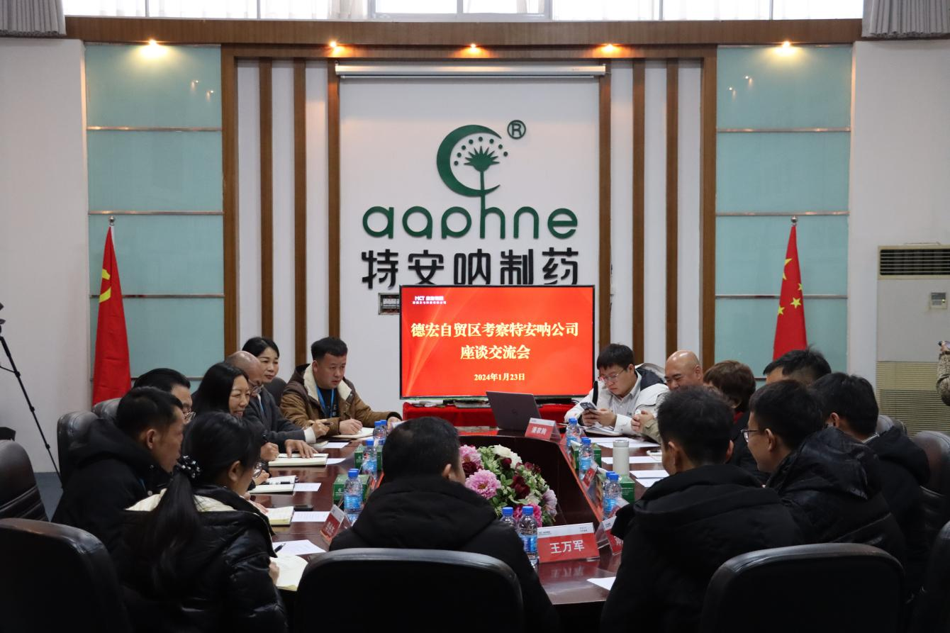 2024年1月23日,中國(guó)(云南)自由貿(mào)易試驗(yàn)區(qū)德宏片區(qū)管委會(huì)副主任王懿一行調(diào)研特安吶公司,就沿邊貿(mào)易合作進(jìn)行交流座談,并參觀三七交易數(shù)字產(chǎn)業(yè)平臺(tái)、三七國(guó)際交易中心。特安吶公司黨支部書記、副董事長(zhǎng)、常務(wù)副總經(jīng)理鄒慧寧,總經(jīng)理劉加強(qiáng),三七交易數(shù)字產(chǎn)業(yè)平臺(tái)負(fù)責(zé)人陳建華陪同調(diào)研。