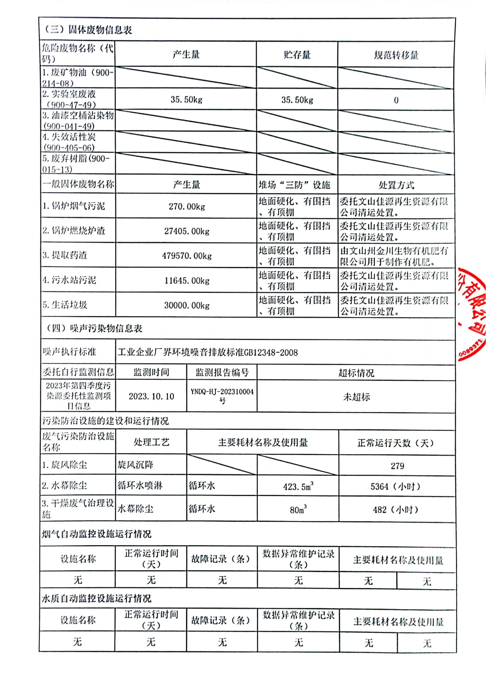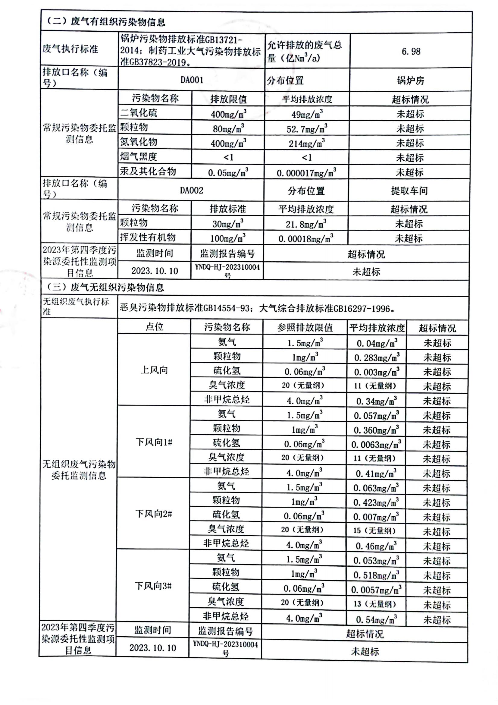 2023年第四季度云南特安吶制藥股份有限公司環(huán)境信息公開(kāi)表