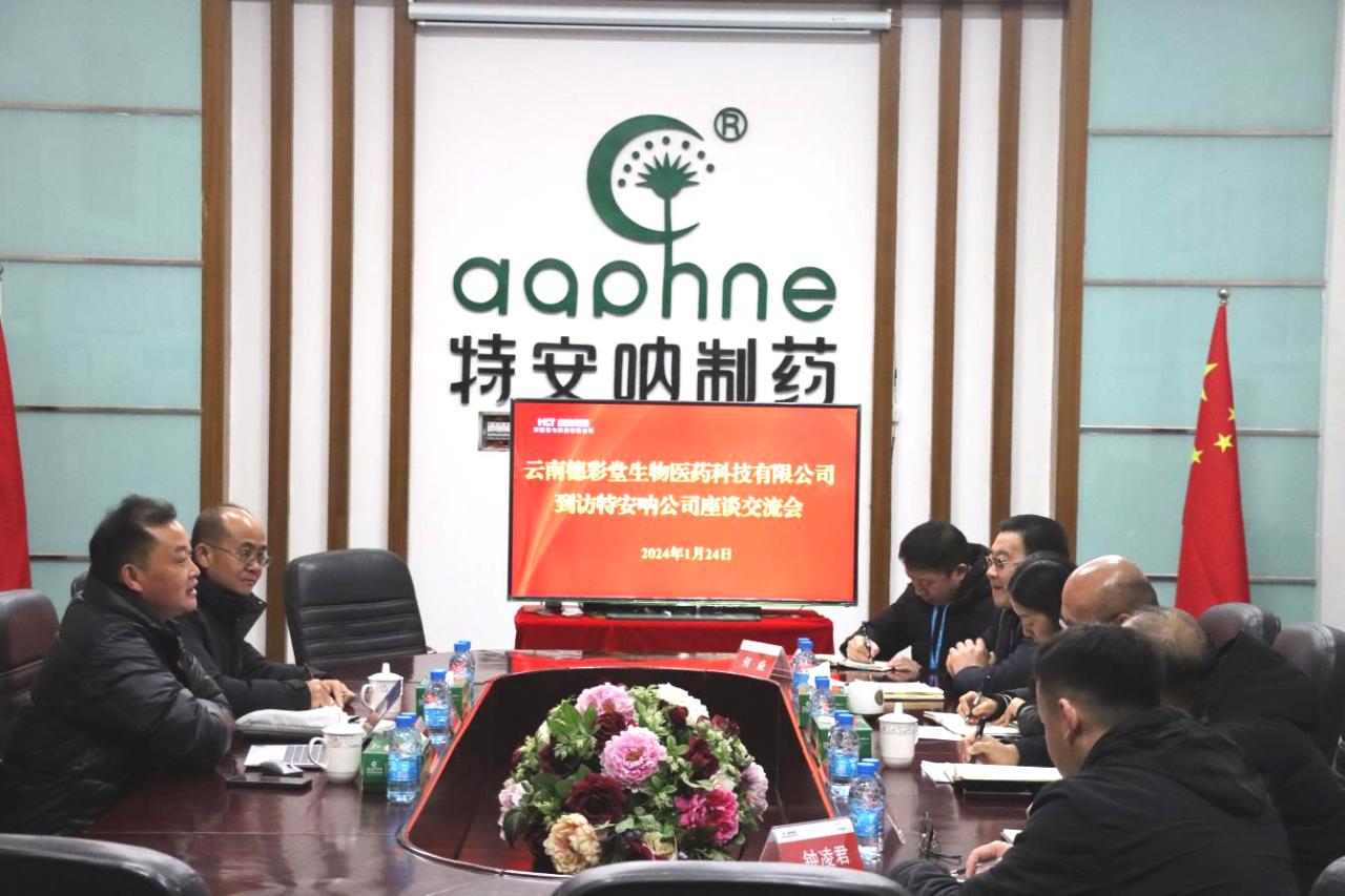 1月24日,云南德彩堂生物醫(yī)藥有限公司總經(jīng)理龍祥、副總經(jīng)理羅銀平到訪特安吶公司,就產(chǎn)品研發(fā)及行業(yè)政策進(jìn)行了深入的座談交流。公司黨支部書(shū)記、副董事長(zhǎng)、常務(wù)副總經(jīng)理鄒慧寧,總經(jīng)理劉加強(qiáng),副總經(jīng)理鄭傳云參加座談。