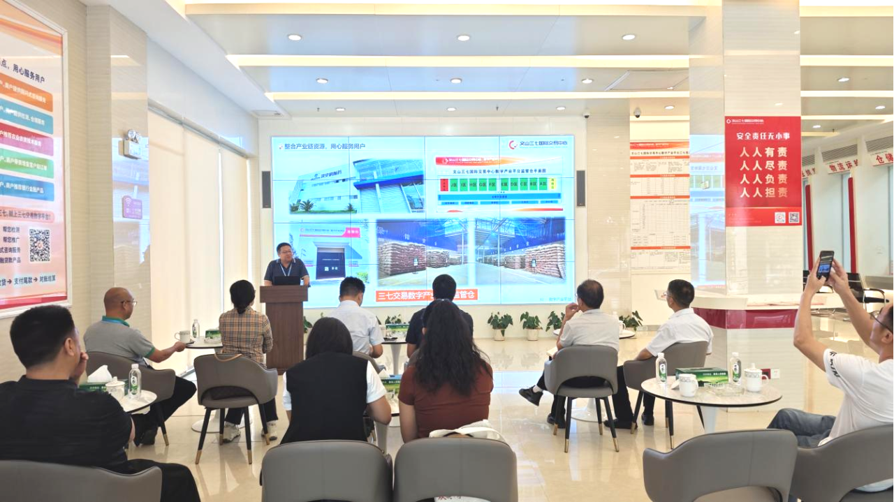 熊仕祿一行先行前往三七交易數(shù)字平臺(tái)進(jìn)行調(diào)研,聽(tīng)取了數(shù)字平臺(tái)負(fù)責(zé)人陳建華對(duì)線上交易平臺(tái)建設(shè)、管理規(guī)范的介紹,深入了解了文山州三七交易模式向數(shù)字化信息化轉(zhuǎn)型的建設(shè)情況。
