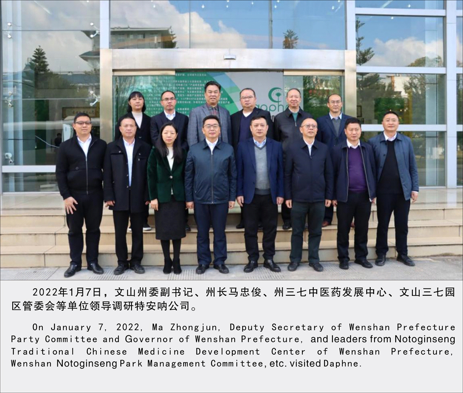 2022年1月7日,文山州委副書記、州長馬忠俊、州三七中醫(yī)藥發(fā)展中心、文山三七園 區(qū)管委會等單位領導調研特安吶公司。