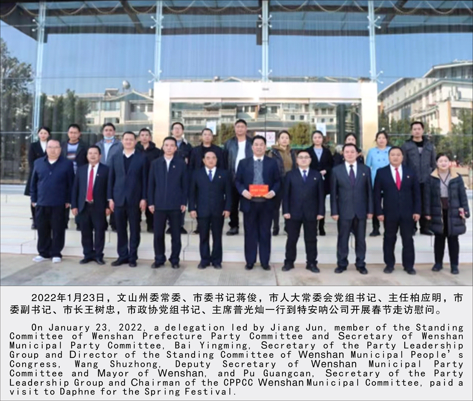 2022年1月23日,文山州委常委、市委書記蔣俊,市人大常委會黨組書記、主任柏應明,市委副書記、市長王樹忠,市政協(xié)黨組書記、主席普光燦一行到特安吶公司開展春節(jié)走訪慰問。