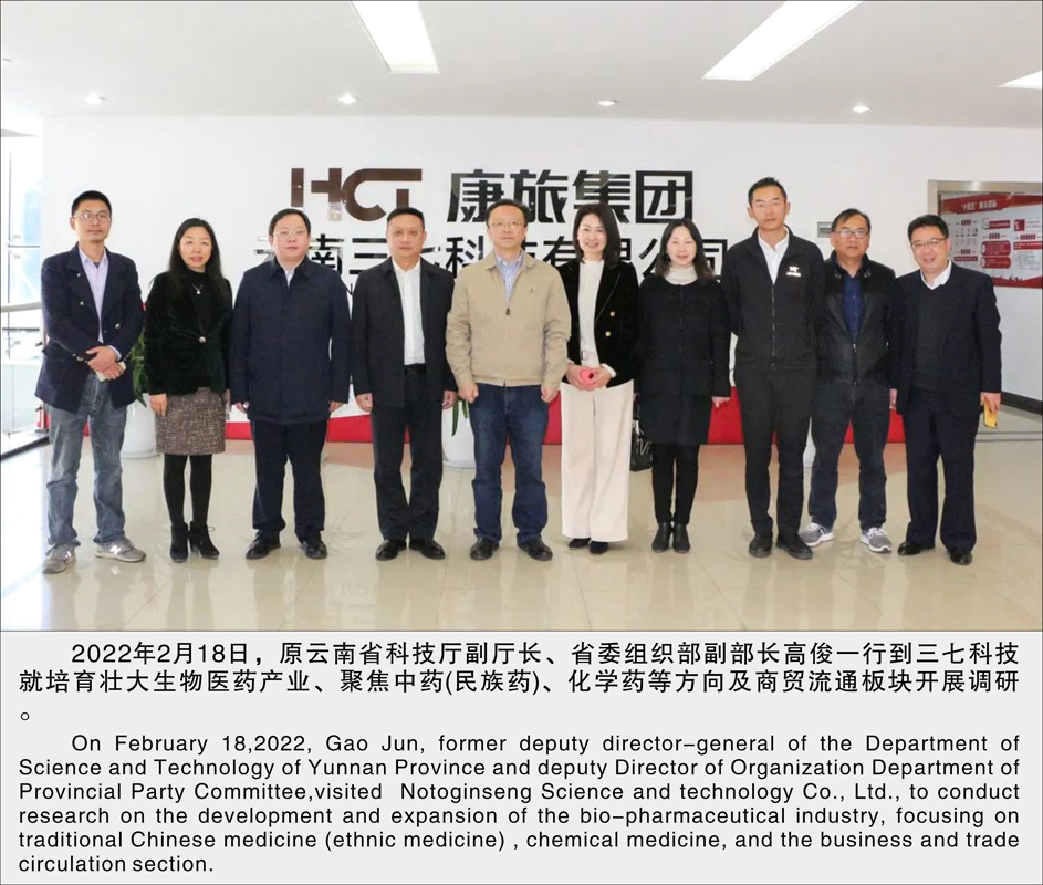 2022年2月18,原云南省科技廳副廳長、省委組織部副部長高俊一行到三七科技就培育壯大生物醫(yī)藥產(chǎn)業(yè)、聚焦中藥(民族藥)、化學(xué)藥等方向及商貿(mào)流通板塊開展調(diào)研