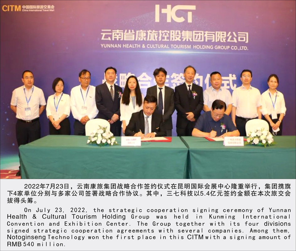 2022年7月23日,云南康旅集團戰(zhàn)略合作簽約儀式在昆明國際會展中心隆重舉行,集團攜旗下4家單位分別與多家公司簽署戰(zhàn)略合作協(xié)議。其中,三七科技以5.4億元簽約金額在本次旅交會拔得頭籌。