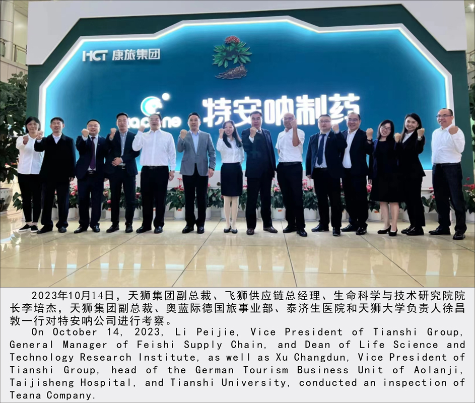 2023年10月14日,天獅集團(tuán)副總裁、飛獅供應(yīng)鏈總經(jīng)理、生命科學(xué)與技術(shù)研究院院長李培杰,天獅集團(tuán)副總裁、奧藍(lán)際德國旅事業(yè)部、泰濟(jì)生醫(yī)院和天獅大學(xué)負(fù)責(zé)人徐昌敦一行對特安吶公司進(jìn)行考察。