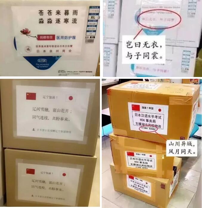 日本政府在疫情開(kāi)始的第一時(shí)刻,就保證會(huì)幫助中國(guó)渡過(guò)難關(guān)。日本株式會(huì)社捐贈(zèng)了3300套防護(hù)服、6000雙鞋套、賦詞豈日無(wú)衣,與子同裳。富山縣向友好省縣遼寧省捐贈(zèng)了一萬(wàn)枚口罩,上面寫(xiě)著:遼河雪融,富士花;同氣連枝,共盼春來(lái)。HSK事務(wù)所捐贈(zèng)了兩萬(wàn)枚口罩,上面寫(xiě)著:山川異域,風(fēng)月同天。