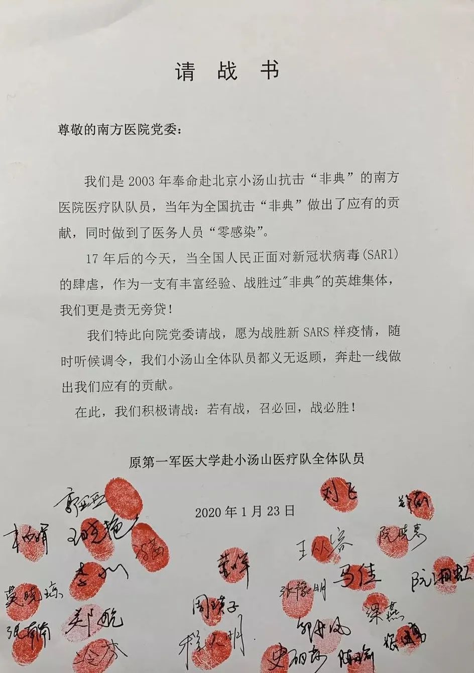 在武漢戰(zhàn)“疫”最吃緊的時(shí)刻,各地醫(yī)療隊(duì)紛紛主動(dòng)請(qǐng)纓。非典期間“零感染”的醫(yī)療隊(duì)伍——解放軍小湯山醫(yī)院,率先提交了“請(qǐng)戰(zhàn)書”。