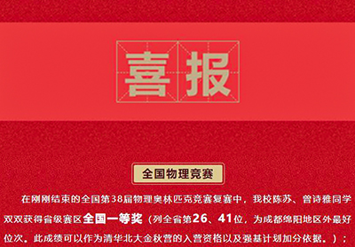 在剛剛結(jié)束的全國(guó)第38屆物理奧林匹克競(jìng)賽復(fù)賽中,我校陳蘇、曾詩(shī)雅同學(xué)雙雙獲得省級(jí)賽區(qū)全國(guó)一等...