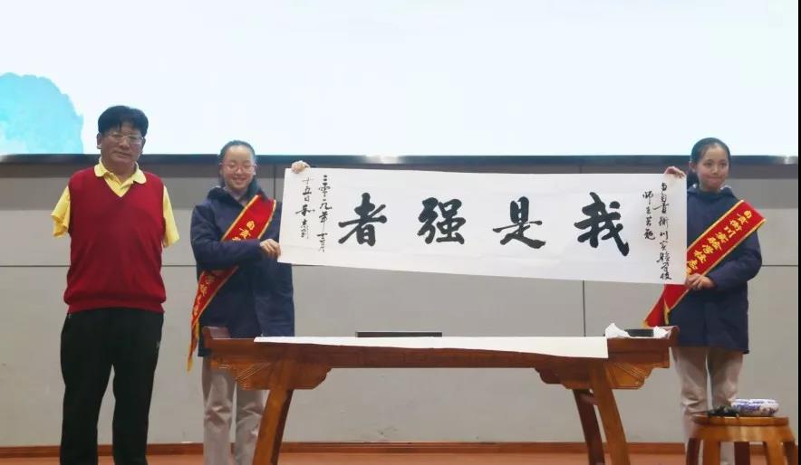 隨后,和老師現(xiàn)場揮毫潑墨,獲得了師生雷鳴般的掌聲。這掌聲是為其遒勁書法,更為其勵志人生。