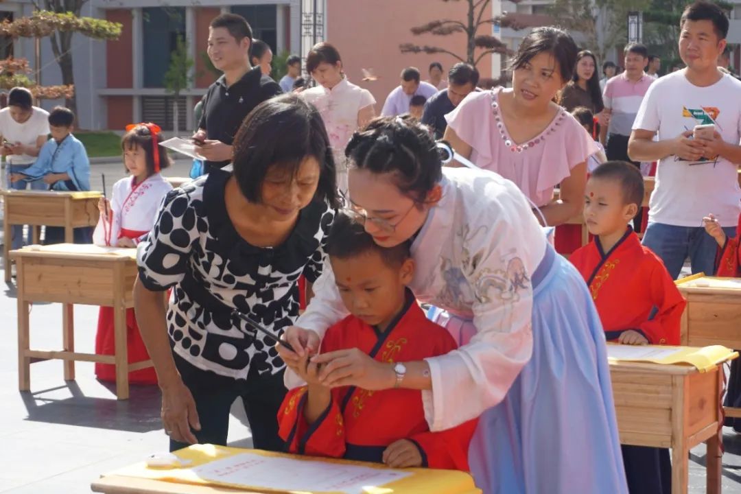 學校領導和老師們俯下身子,笑意盈盈地逐個為孩子們點朱砂,一張張稚氣的臉上多了一分靈氣和自信。