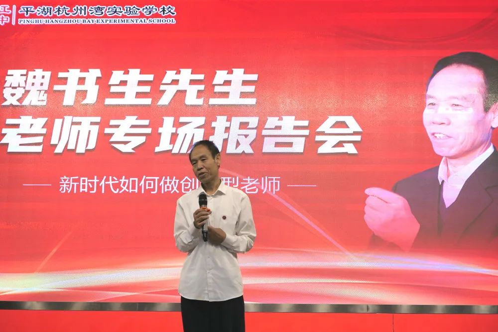 2020年9月15日上午,被喻為“穿西裝的孔子”的當(dāng)代教育家魏書生來我校為全體教職工進行以“新時代如何做創(chuàng)新型老師”為主題的專場思想報告會。嘉興教育學(xué)院處長沈俊松先生,嘉興港區(qū)社發(fā)局文教衛(wèi)副書記顧巧明先生,平湖實驗小學(xué)教育集團黨委書記、總校長芮金良先生,乍浦高級中學(xué)黨總支書記、校長曹躍平先生,平湖實驗小學(xué)教育集團副總校長、毓秀小學(xué)校長湯麗英女士,平湖杭州灣實驗學(xué)校理事長肖家興博士,北大親子教育專家孫一鳴老師,海寧市南苑中學(xué)、嘉興市城南中學(xué)、嘉興市運河實驗學(xué)校、嘉興市城南小學(xué)等學(xué)校,以及平湖市、港區(qū)兄弟學(xué)校的老師們紛紛慕名而來,聆聽長者教誨。