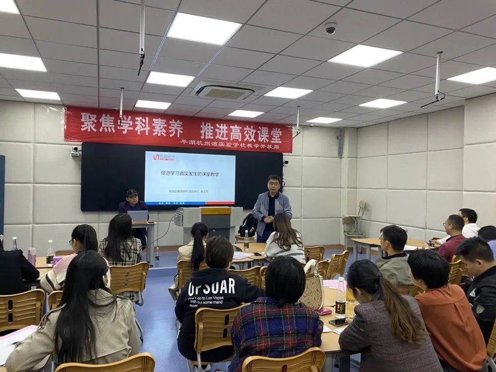 中午,我們有幸請到嘉興市學科帶頭人、嘉興市南湖區(qū)教研員朱文平專家為我們做了題為《促進學習真實發(fā)生的課堂教學》微型報告。朱老師給我們指出,教學改革的核心是“改變教與學的關(guān)系”。“教是為了不教,教為了學;少教多學,變教為學”是教學改革的方向,我們應(yīng)當基于學科特征、學習內(nèi)容特征、學生學習特征選擇合適的學教方式,使學習方式多元化,從而學習行為多樣化,學生才能夠更好地獲得知識。