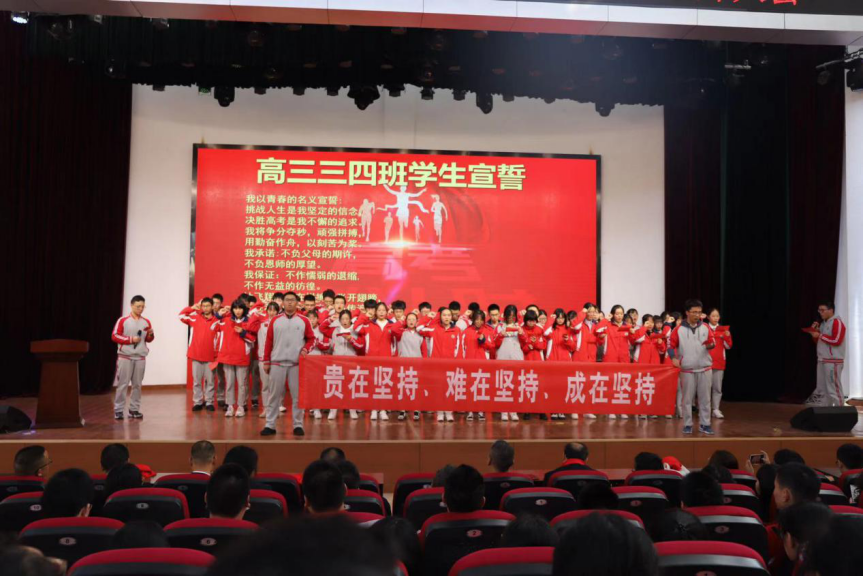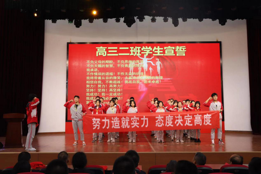 各班學(xué)生分別宣誓 高三年級(jí)的四個(gè)班級(jí)逐一上臺(tái),為全體師生展現(xiàn)本班的風(fēng)采。“同闖崢嶸十春秋,共創(chuàng)輝煌佳年華”“努力造就實(shí)力,態(tài)度決定高度”“貴在堅(jiān)持、難在堅(jiān)持、成在堅(jiān)持”,聽啊,這就是高三學(xué)子的聲音,更是高三學(xué)子面對(duì)高考大關(guān)的無盡信心。