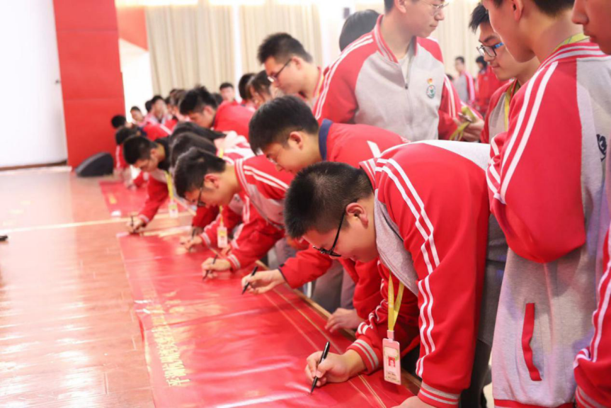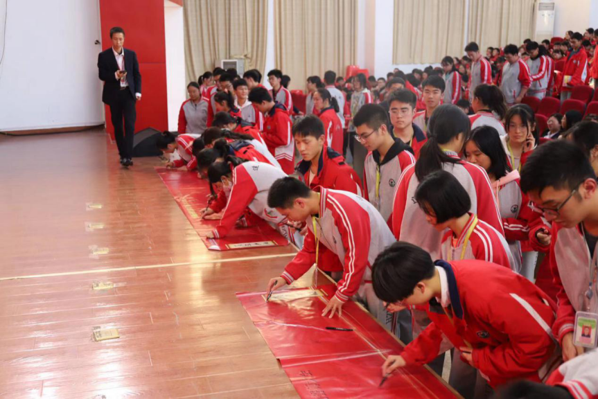 各班學(xué)生分別到臺(tái)前簽名,表達(dá)自己的雄心壯志,堅(jiān)持砥礪前行。一個(gè)個(gè)形各異卻志相同的名字仿佛在無聲地宣告同學(xué)們必定將努力落實(shí)在行動(dòng)上的決心。