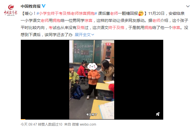 據(jù)老師介紹,這個孩子平時比較內(nèi)向,考試也從來沒有及格過,這次語文終于及格了,于是就用擁抱給孩子一個驚喜。沒想到下課后,孩子還去了辦公室,送給于老師一顆糖。